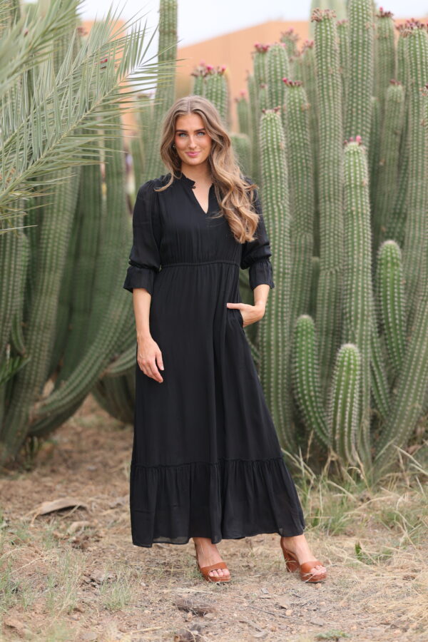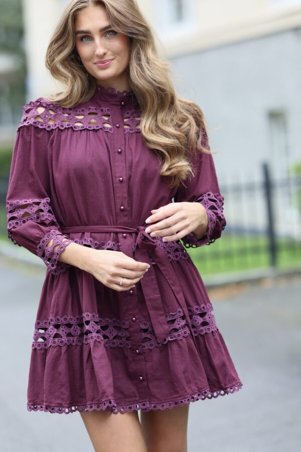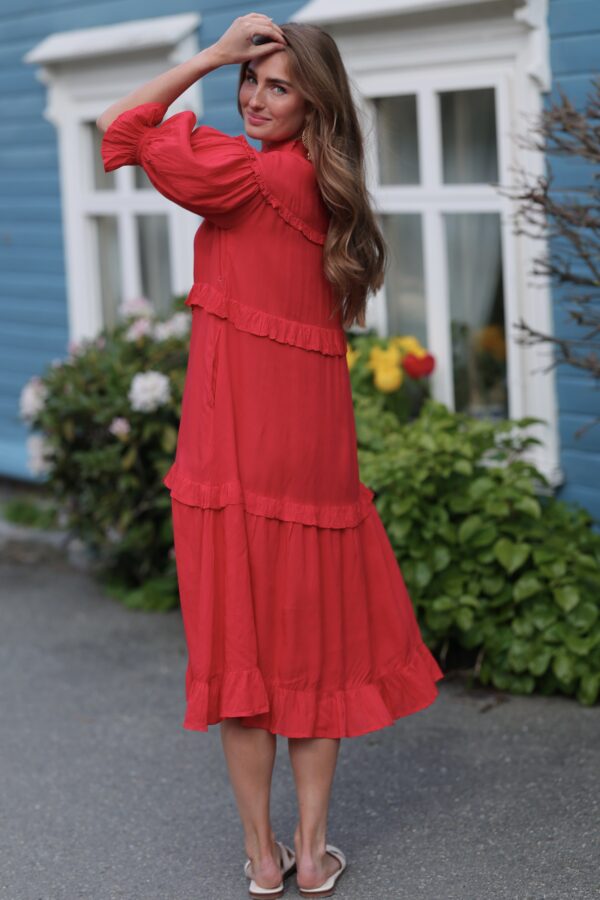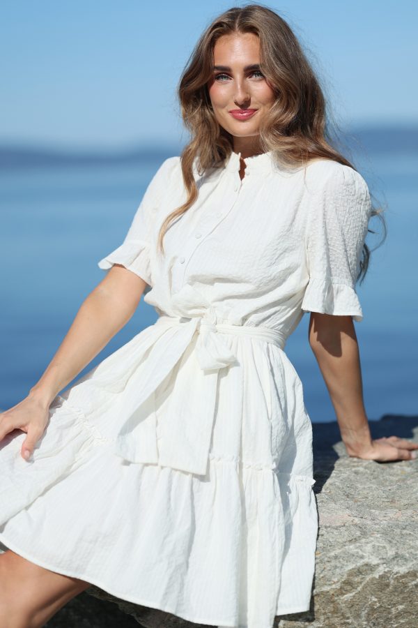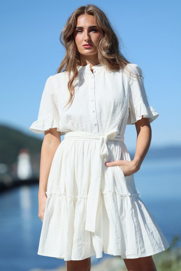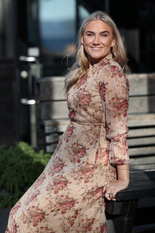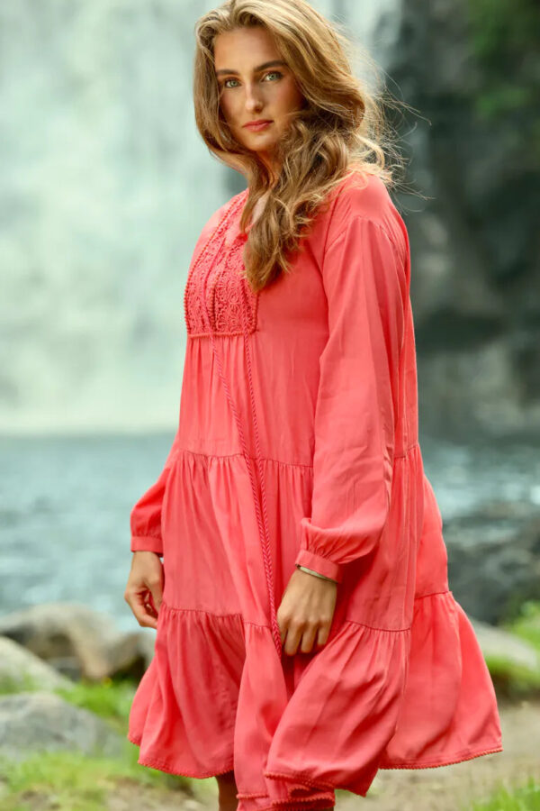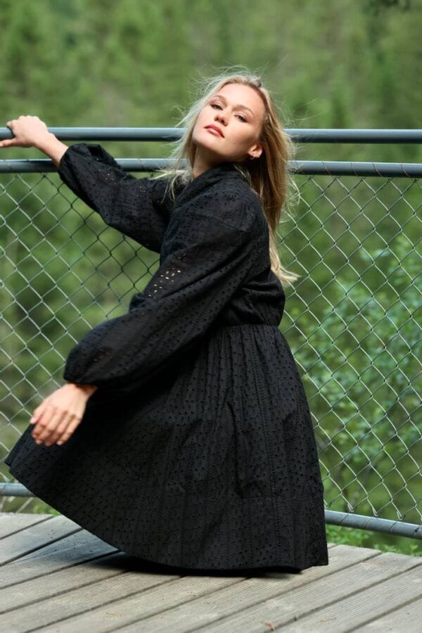 Lotus Dress. Helt fantastisk kjole med de vakreste detaljer over det hele. Gjennombrutte blonder, lommer og knyting i livet for en effortless look. Kjolen er fotsid. Lotus Dress gir deg en perfekt balanse mellom det bohemske og en sofistikert look, som gjør at du føler deg både komfortabel og stilfull til hverdag og fest. Den luftige passformen og de vakre blondene skaper en feminin og avslappet vibe, samtidig som den passer perfekt til både uformelle og litt mer pyntede anledninger.