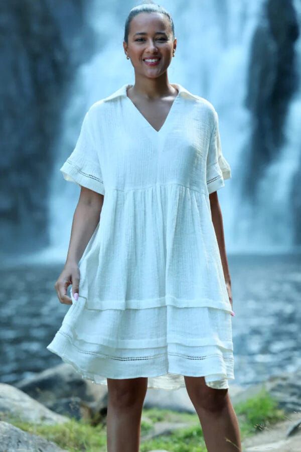 Lotus Dress. Helt fantastisk kjole med de vakreste detaljer over det hele. Gjennombrutte blonder, lommer og knyting i livet for en effortless look. Kjolen er fotsid. Lotus Dress gir deg en perfekt balanse mellom det bohemske og en sofistikert look, som gjør at du føler deg både komfortabel og stilfull til hverdag og fest. Den luftige passformen og de vakre blondene skaper en feminin og avslappet vibe, samtidig som den passer perfekt til både uformelle og litt mer pyntede anledninger.