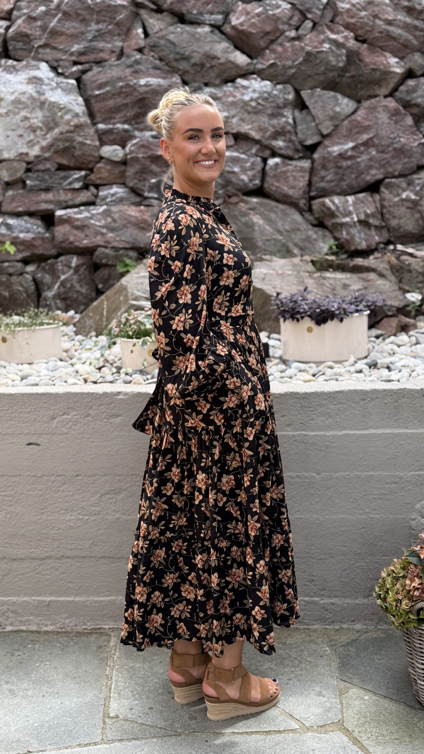 Dette er Ambrosia med lange ermer. Ambrosia er Nectar, rett og slett. Dette er vår mest solgte kjole, nettopp fordi den kler absolutt alle damer. Velg å bruke den med eller uten beltet, for å få den silhuetten du ønsker. Perfekt lengde for en kjole som du kan ta fra dag til kveld. Printet er vårt eget, så du slipper å dumpe borti noen som har en kjole som likner på din… Supermykt og deilig stoff som faller så utrolig fint. Masse vidde i skjørtet. Knapper i front, lange ermer med skjortemansjett og avtagbart belte i livet.