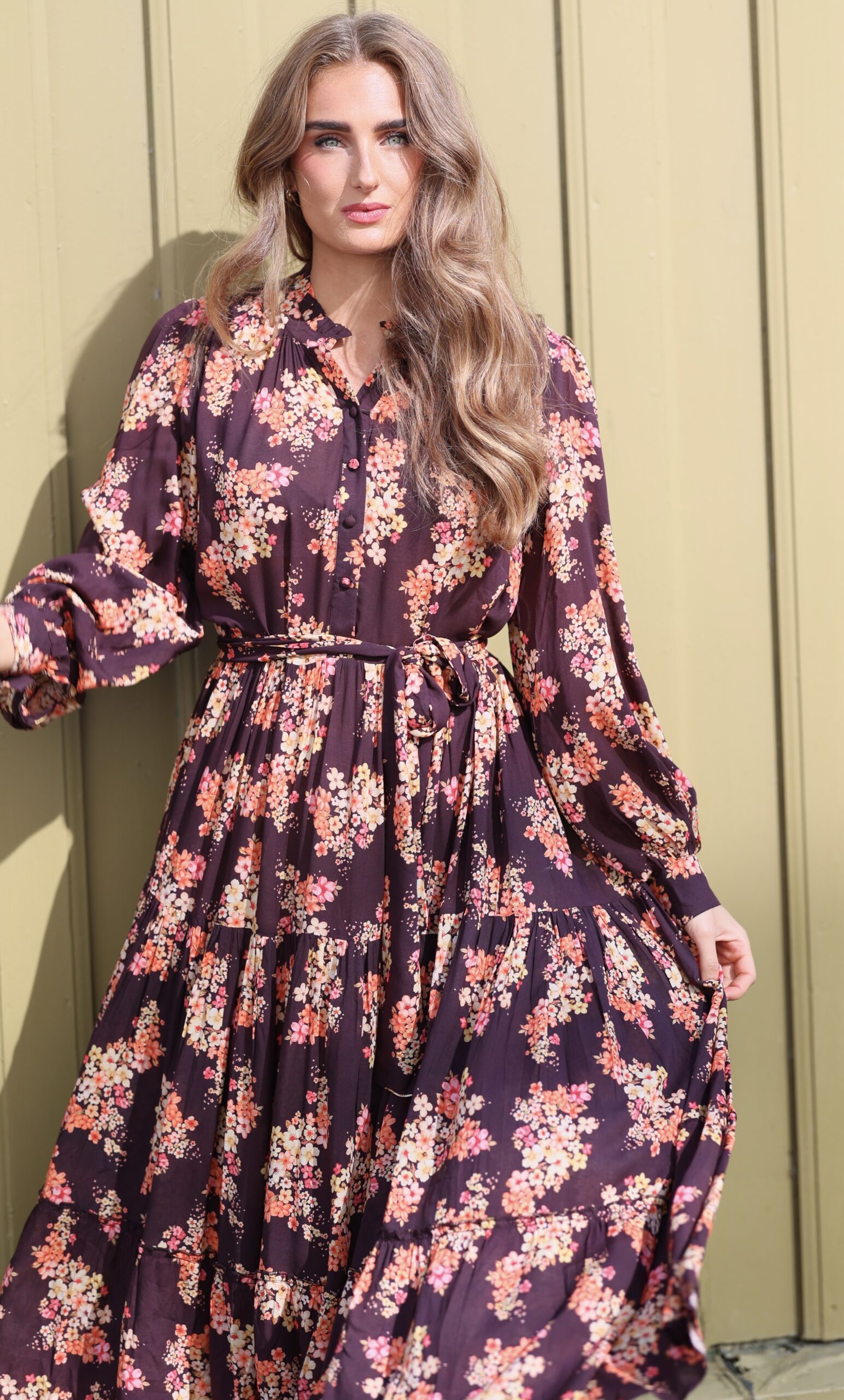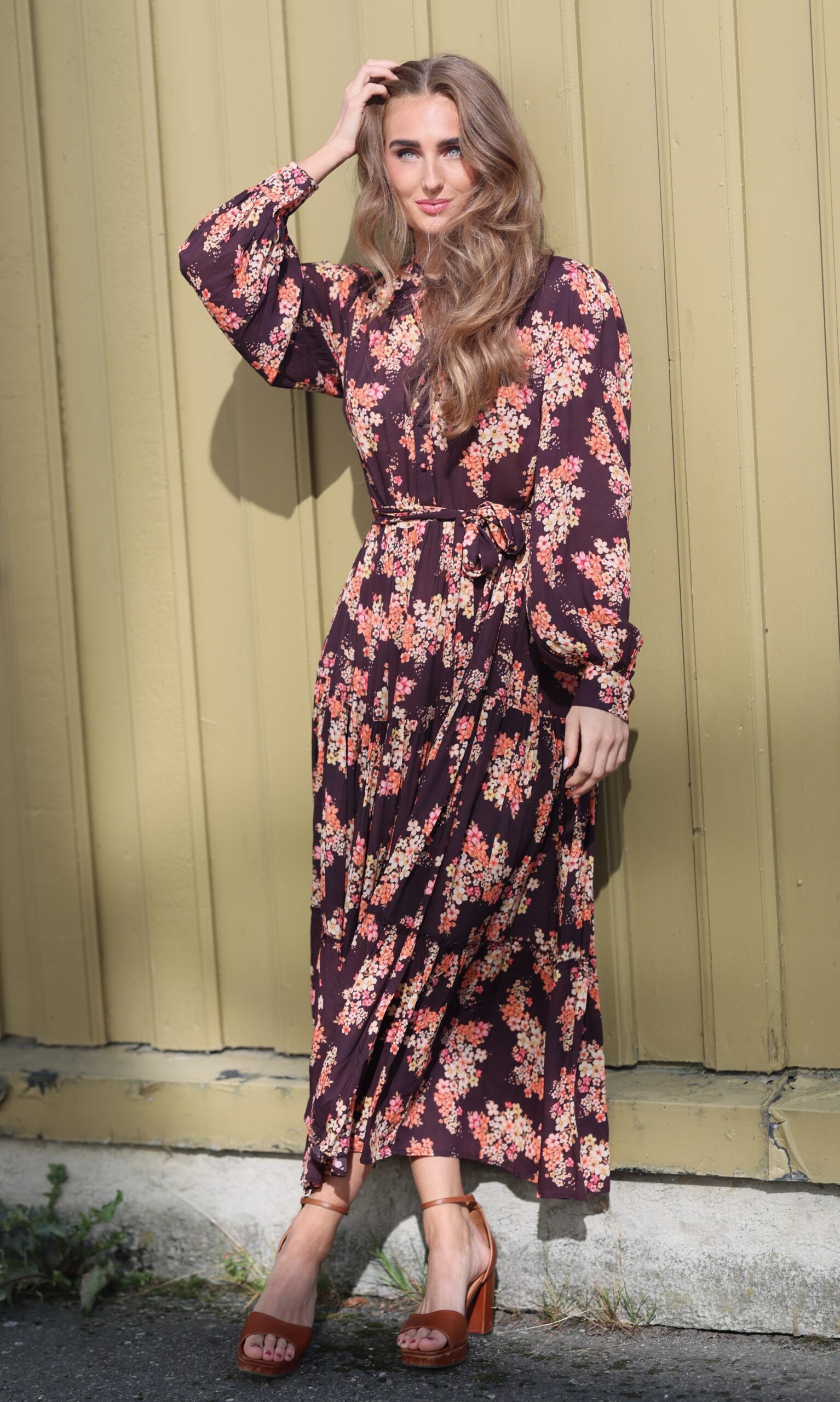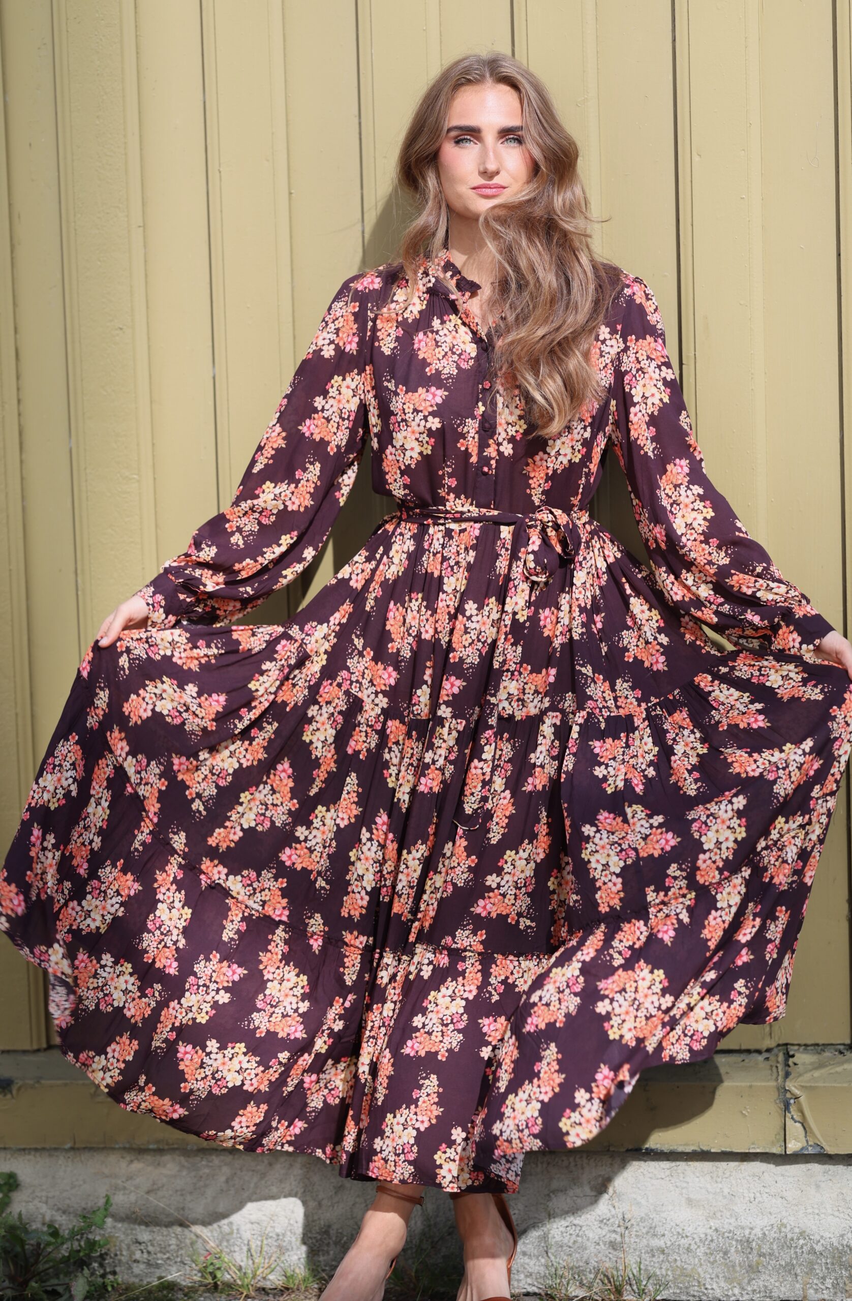Dette er Ambrosia med lange ermer. Ambrosia er Nectar, rett og slett. Dette er vår mest solgte kjole, nettopp fordi den kler absolutt alle damer. Velg å bruke den med eller uten beltet, for å få den silhuetten du ønsker. Perfekt lengde for en kjole som du kan ta fra dag til kveld. Printet er vårt eget, så du slipper å dumpe borti noen som har en kjole som likner på din… Supermykt og deilig stoff som faller så utrolig fint. Masse vidde i skjørtet. Knapper i front, lange ermer med skjortemansjett og avtagbart belte i livet.