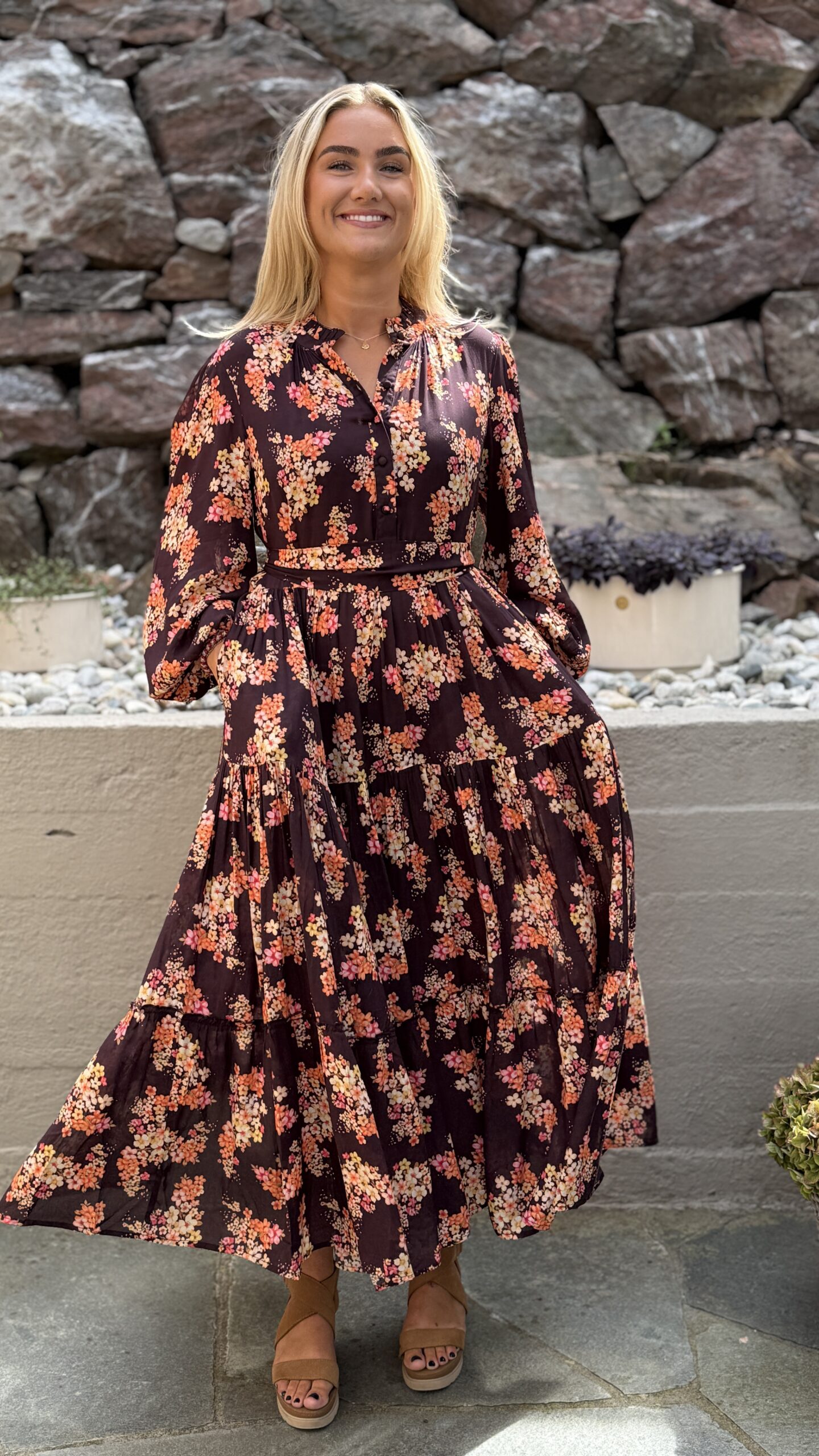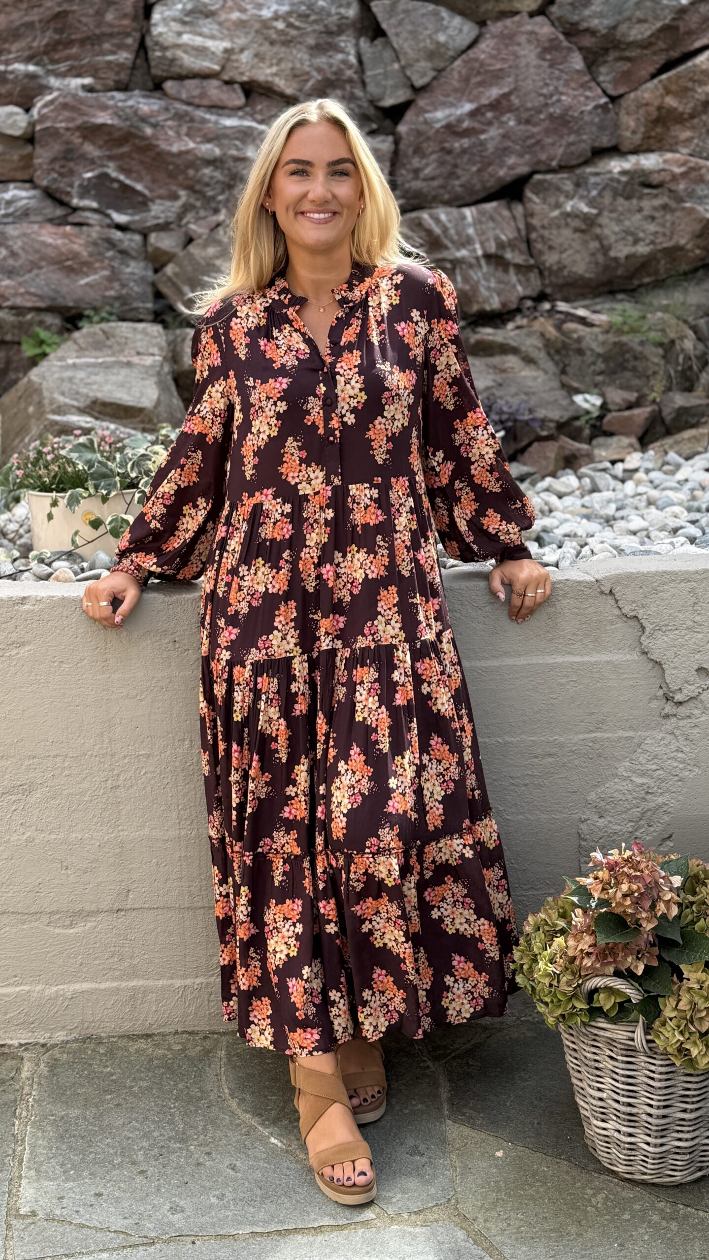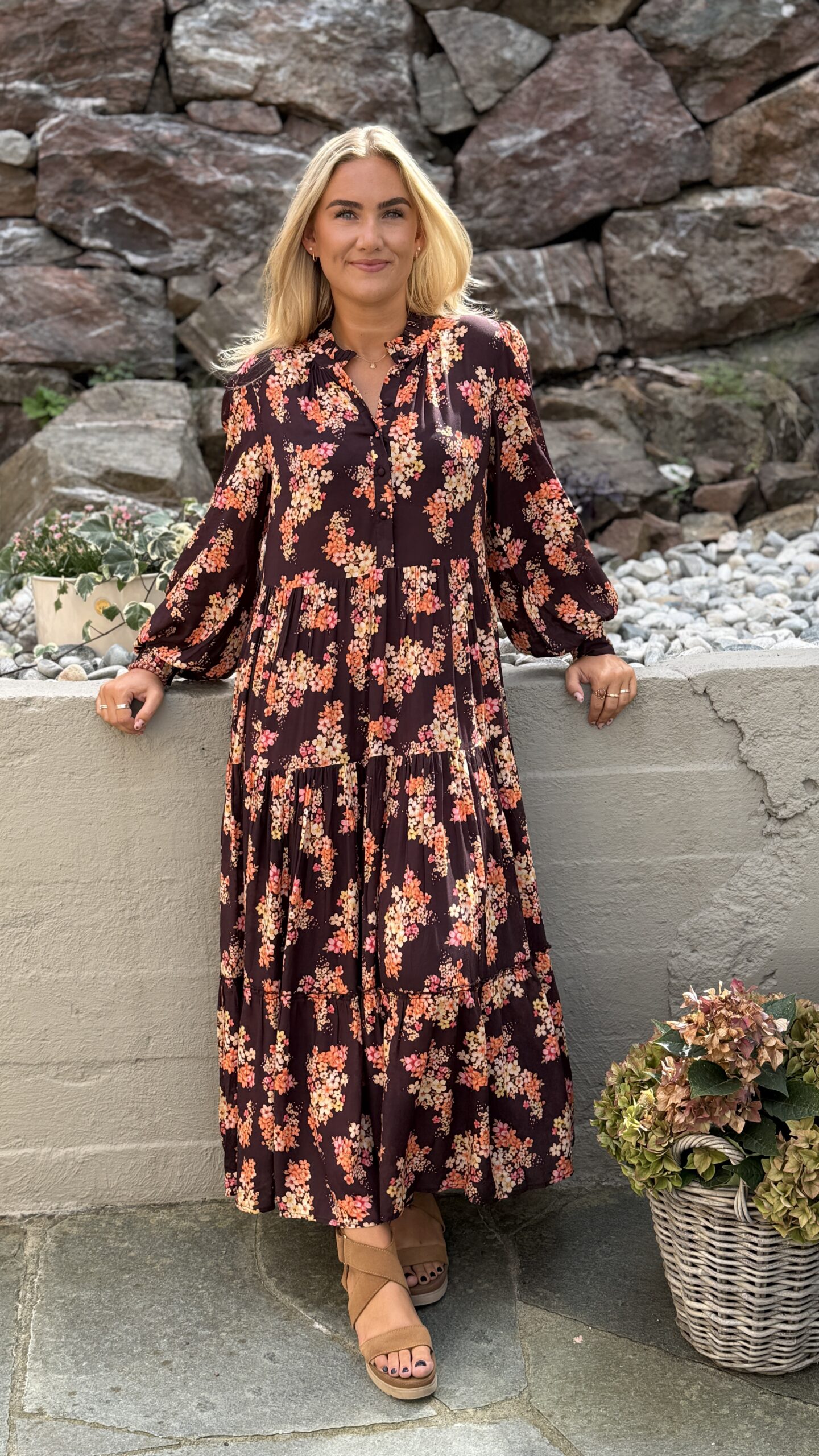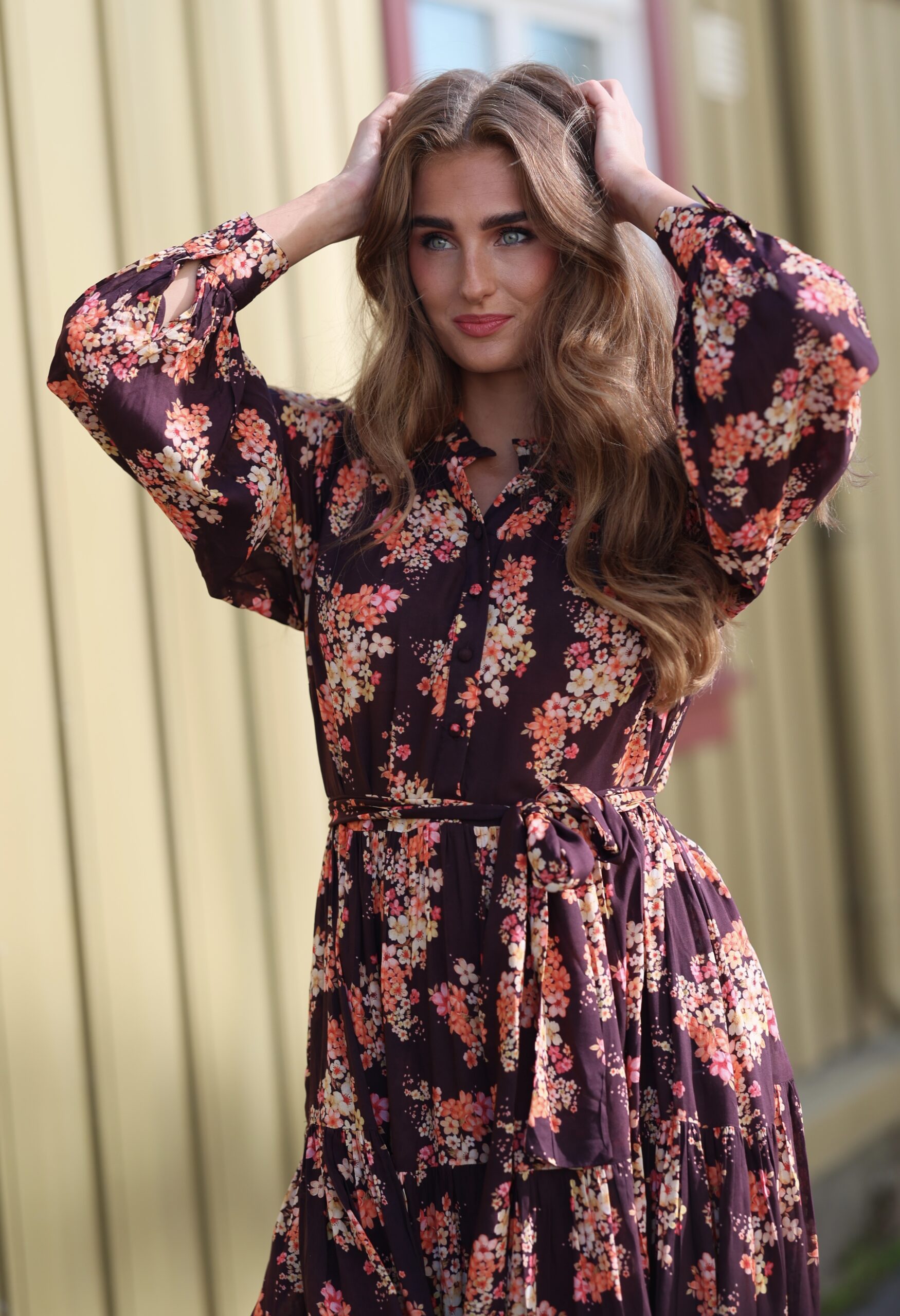 Dette er Ambrosia med lange ermer. Ambrosia er Nectar, rett og slett. Dette er vår mest solgte kjole, nettopp fordi den kler absolutt alle damer. Velg å bruke den med eller uten beltet, for å få den silhuetten du ønsker. Perfekt lengde for en kjole som du kan ta fra dag til kveld. Printet er vårt eget, så du slipper å dumpe borti noen som har en kjole som likner på din… Supermykt og deilig stoff som faller så utrolig fint. Masse vidde i skjørtet. Knapper i front, lange ermer med skjortemansjett og avtagbart belte i livet.