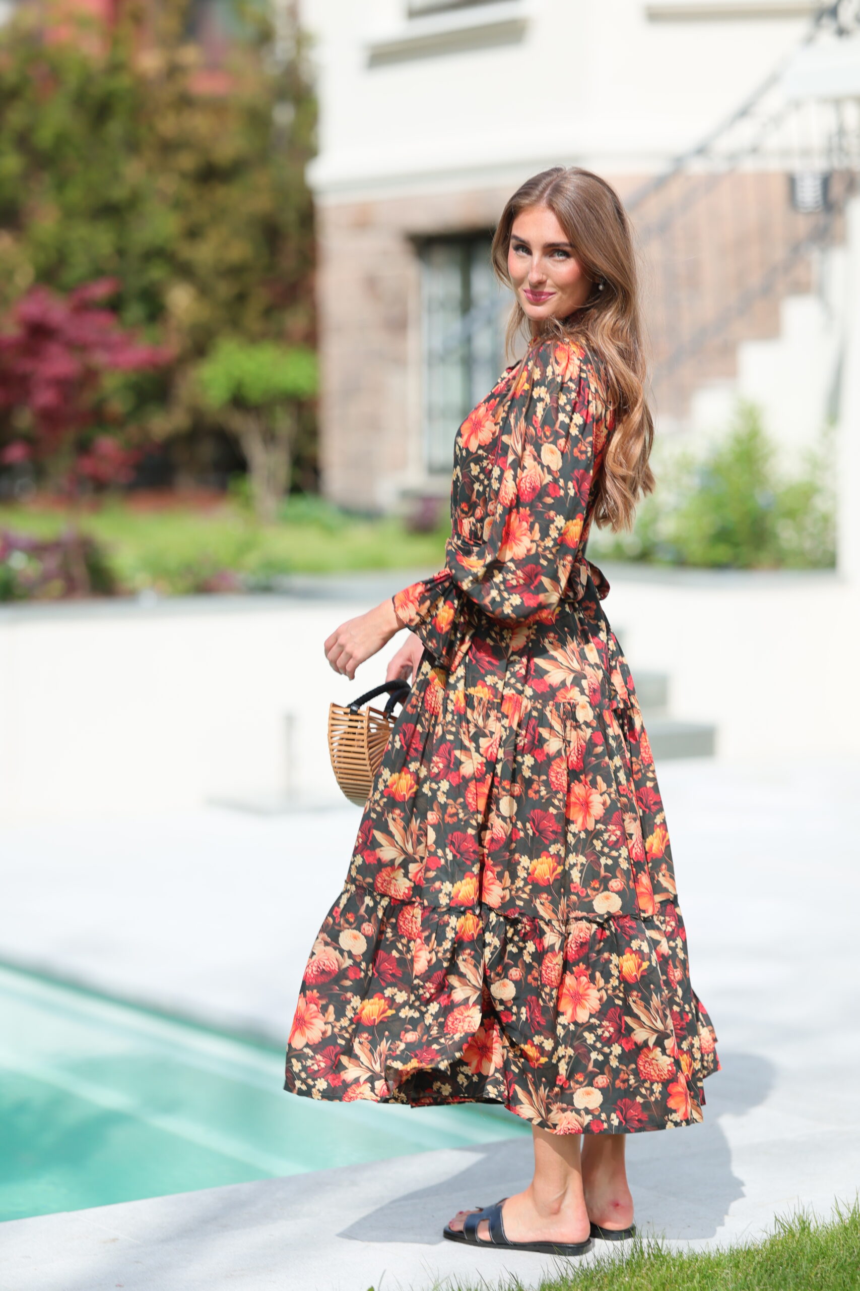 Dette er Ambrosia med lange ermer. Ambrosia er Nectar, rett og slett. Dette er vår mest solgte kjole, nettopp fordi den kler absolutt alle damer. Velg å bruke den med eller uten beltet, for å få den silhuetten du ønsker. Perfekt lengde for en kjole som du kan ta fra dag til kveld. Printet er vårt eget, så du slipper å dumpe borti noen som har en kjole som likner på din… Supermykt og deilig stoff som faller så utrolig fint. Masse vidde i skjørtet. Knapper i front, lange ermer med rysj og avtagbart belte i livet.
