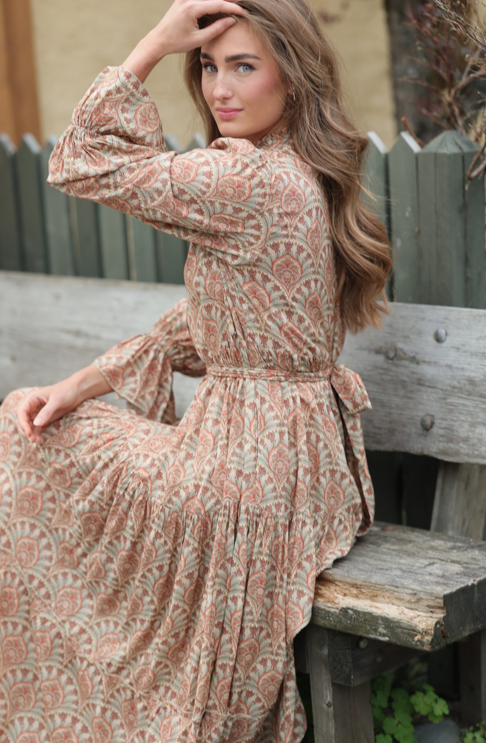 Dette er Ambrosia med lange ermer. Ambrosia er Nectar, rett og slett. Dette er vår mest solgte kjole, nettopp fordi den kler absolutt alle damer. Velg å bruke den med eller uten beltet, for å få den silhuetten du ønsker. Perfekt lengde for en kjole som du kan ta fra dag til kveld. Printet er vårt eget, så du slipper å dumpe borti noen som har en kjole som likner på din… Supermykt og deilig stoff som faller så utrolig fint. Masse vidde i skjørtet. Knapper i front, lange ermer med rysj og avtagbart belte i livet.
