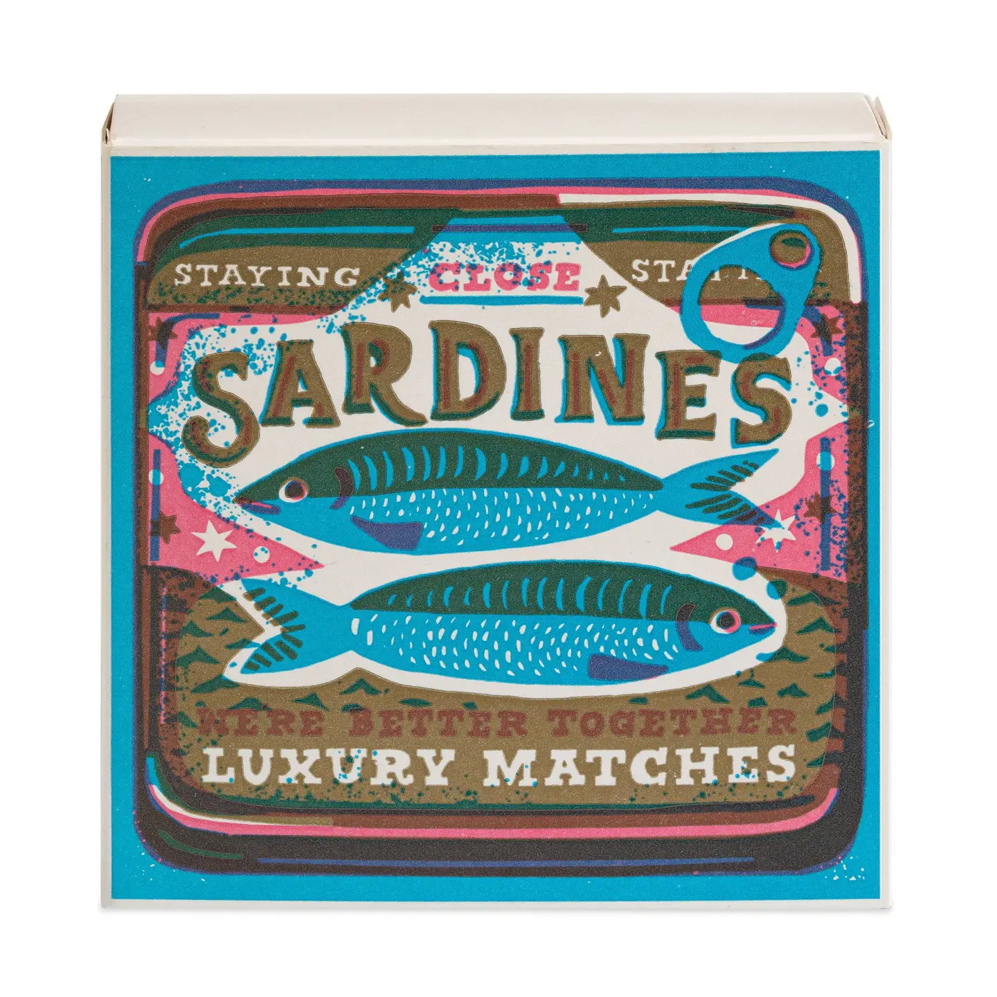 Vår signatur-fyrstikkeske i kvadratisk format, prydet med en illustrasjon av to sardiner i rosa- og blåtoner, sammen med teksten ‘Sardines, We’re Better Together, Luxury Matches.’ Designet av The Printed Peanut.