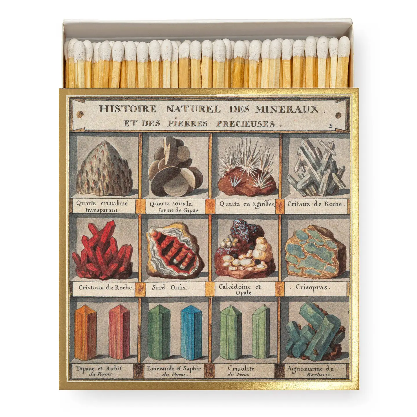 Vår kvadratiske signatur-fyrstikkeske, prydet med illustrasjoner av tolv ulike mineraler i nøytrale og jordnære toner.