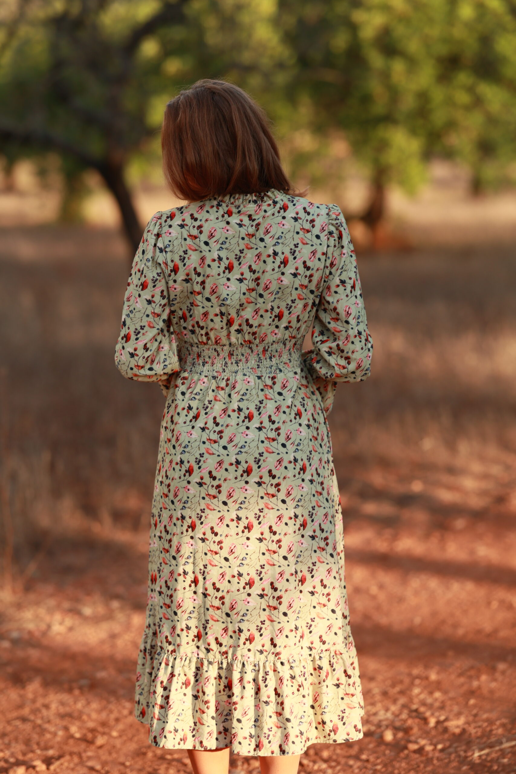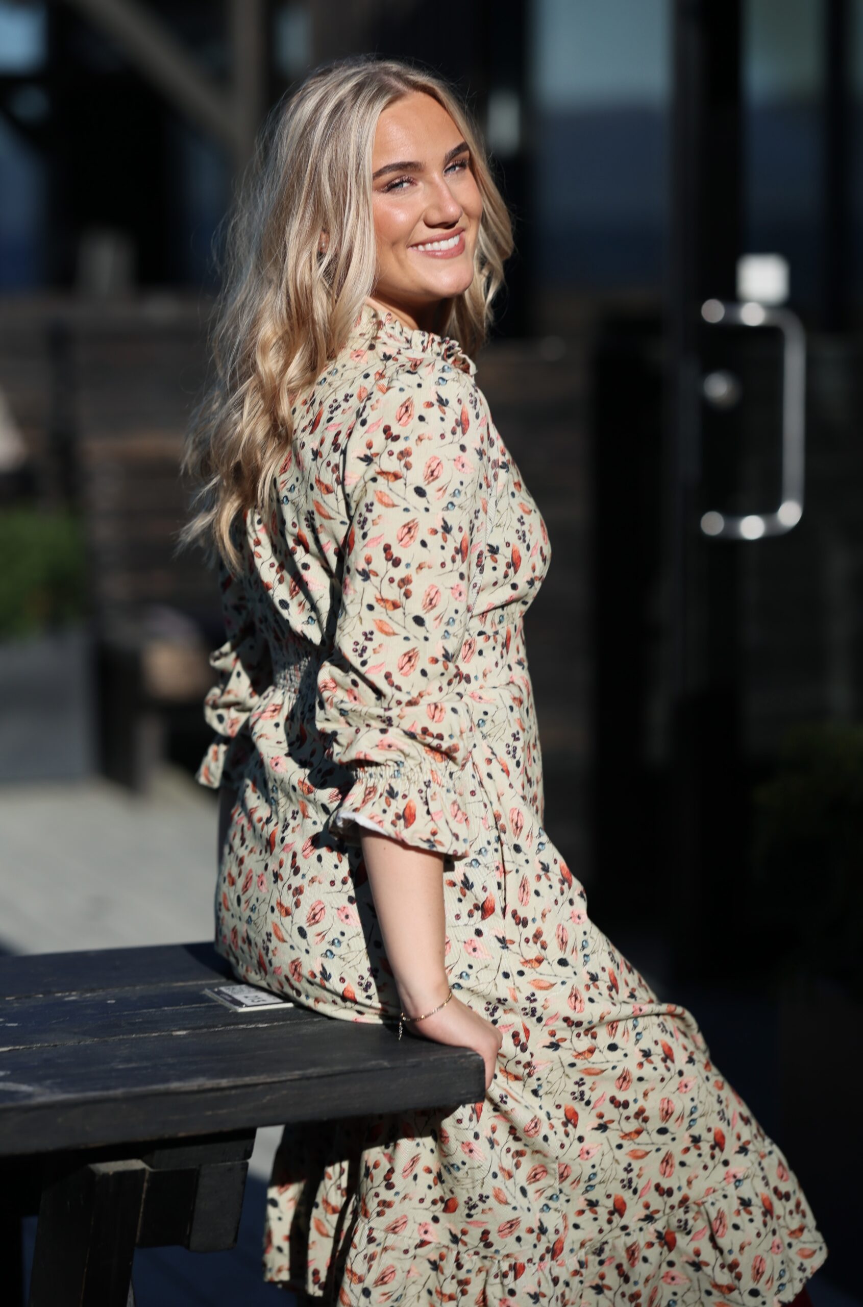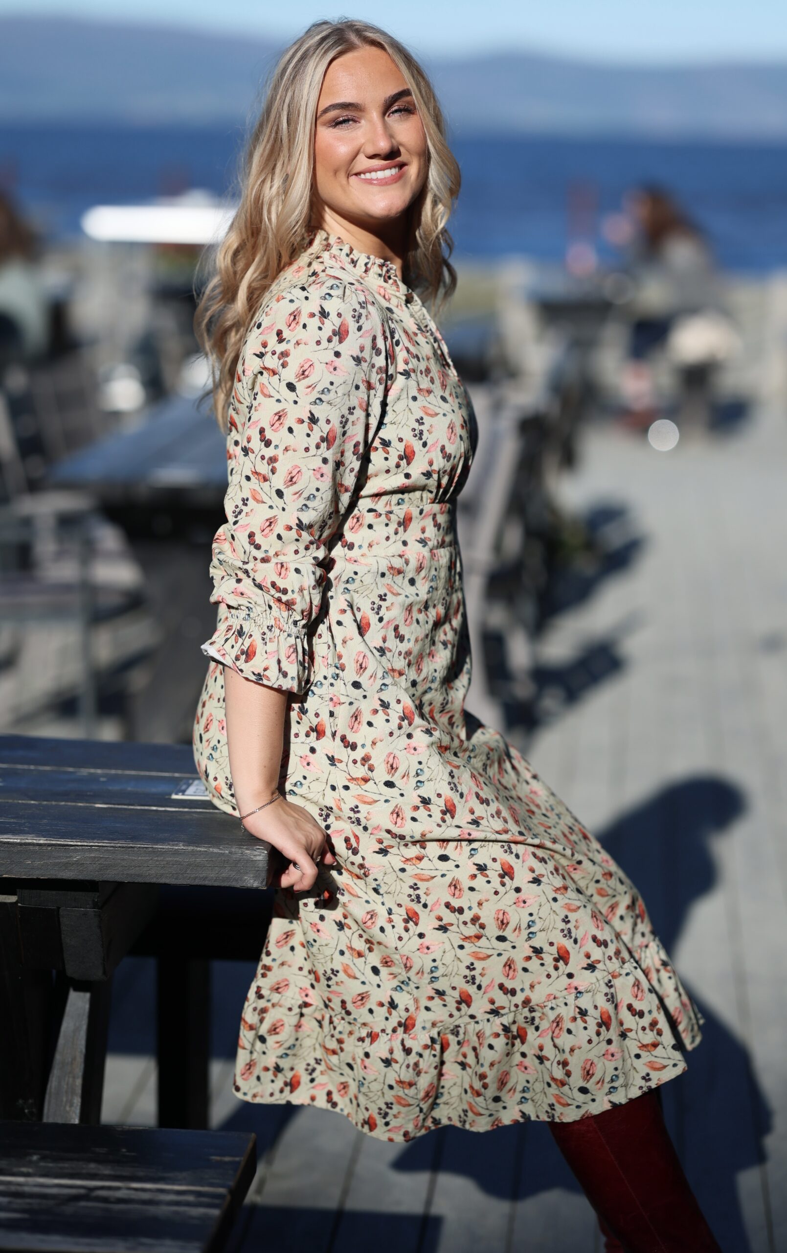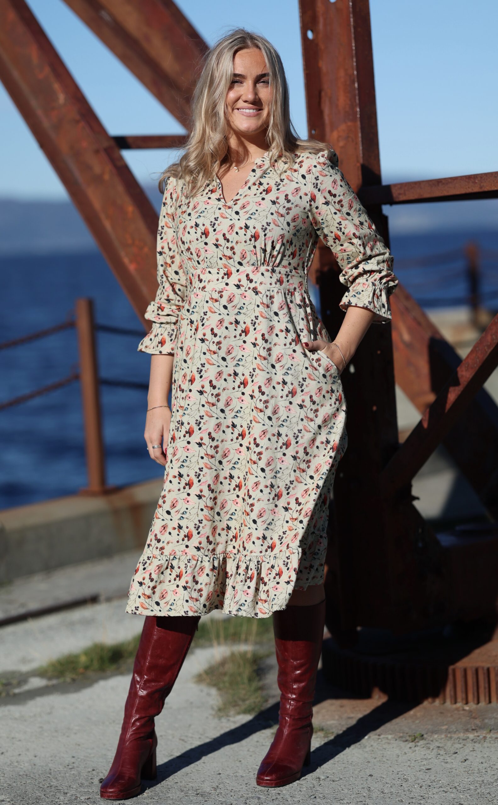Herlig kjole i mykeste babycord med elastikk i livet og på ermene. Kledelig fason med lommer og liten volang nederst. Dette er den beste kjolen du kan ha på deg, som tar deg fra dag til kveld og som lett som en plett kan pyntes både opp og ned. Match den med boots, hæler eller et par kule sneakers. Og en deilig strikk eller hva med en stilig skinnjakke?