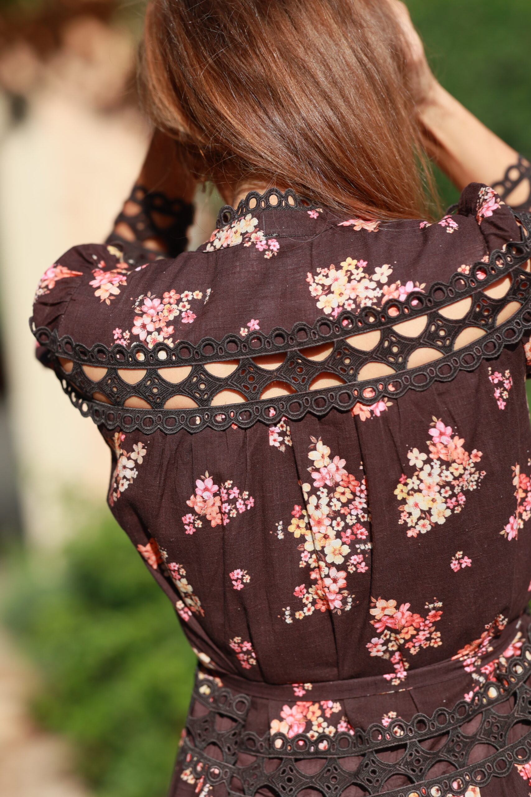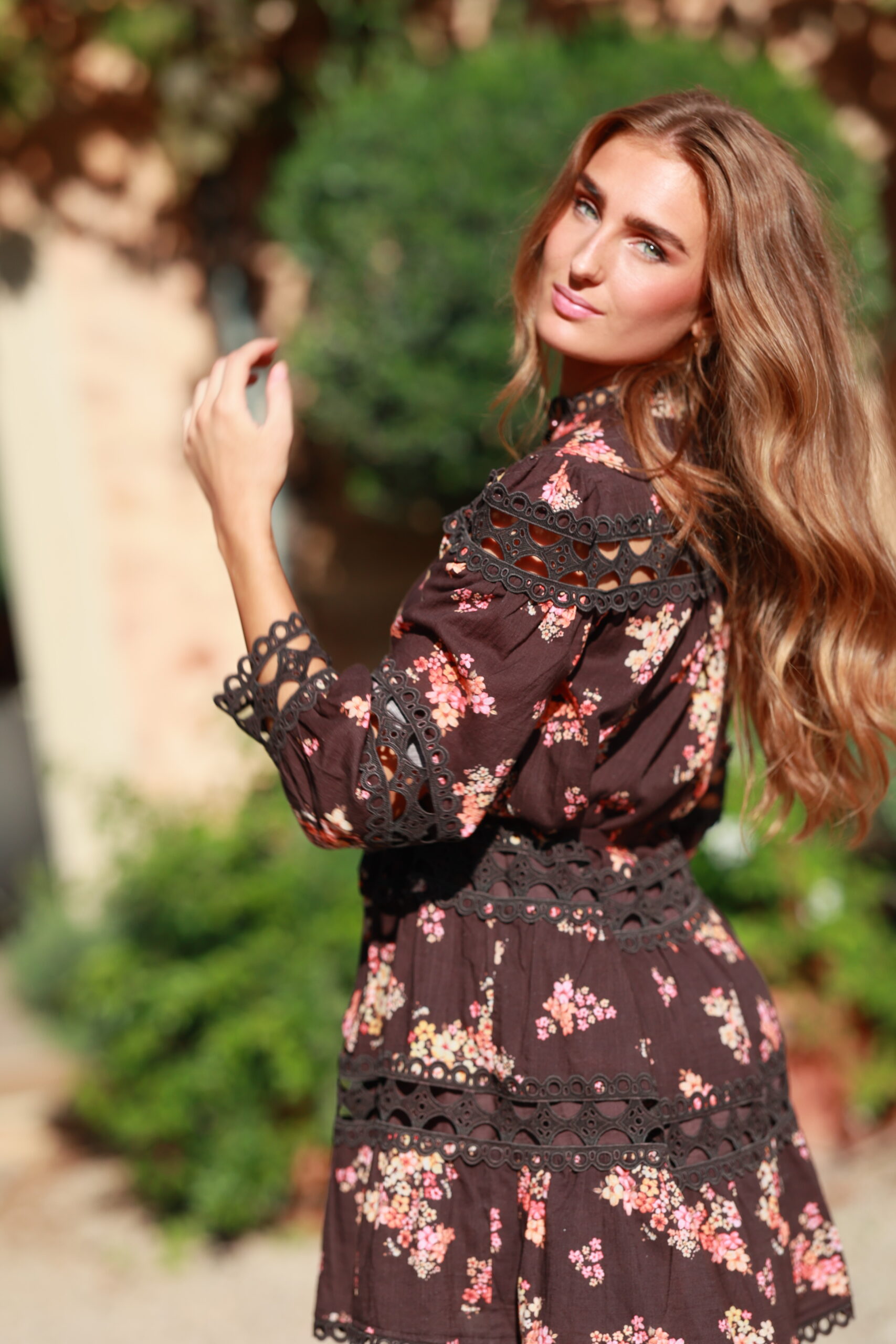 Helt fantastisk kjole med nydelig mønster og de fineste blondedetaljene. Merk at kjolen blir 7 cm lengre enn på bildet, i tillegg til at Hedda er 178 cm. Så kjolen går til rett over knærne. Superlekker hele året, enten på sommeren med bare ben eller gjennom høsten og vinteren med strikk og feks. boots. Vakker kjole med masse vidde som kan brukes både med og uten belte. Blondedetaljer over det hele. Knapper i front for lukking.