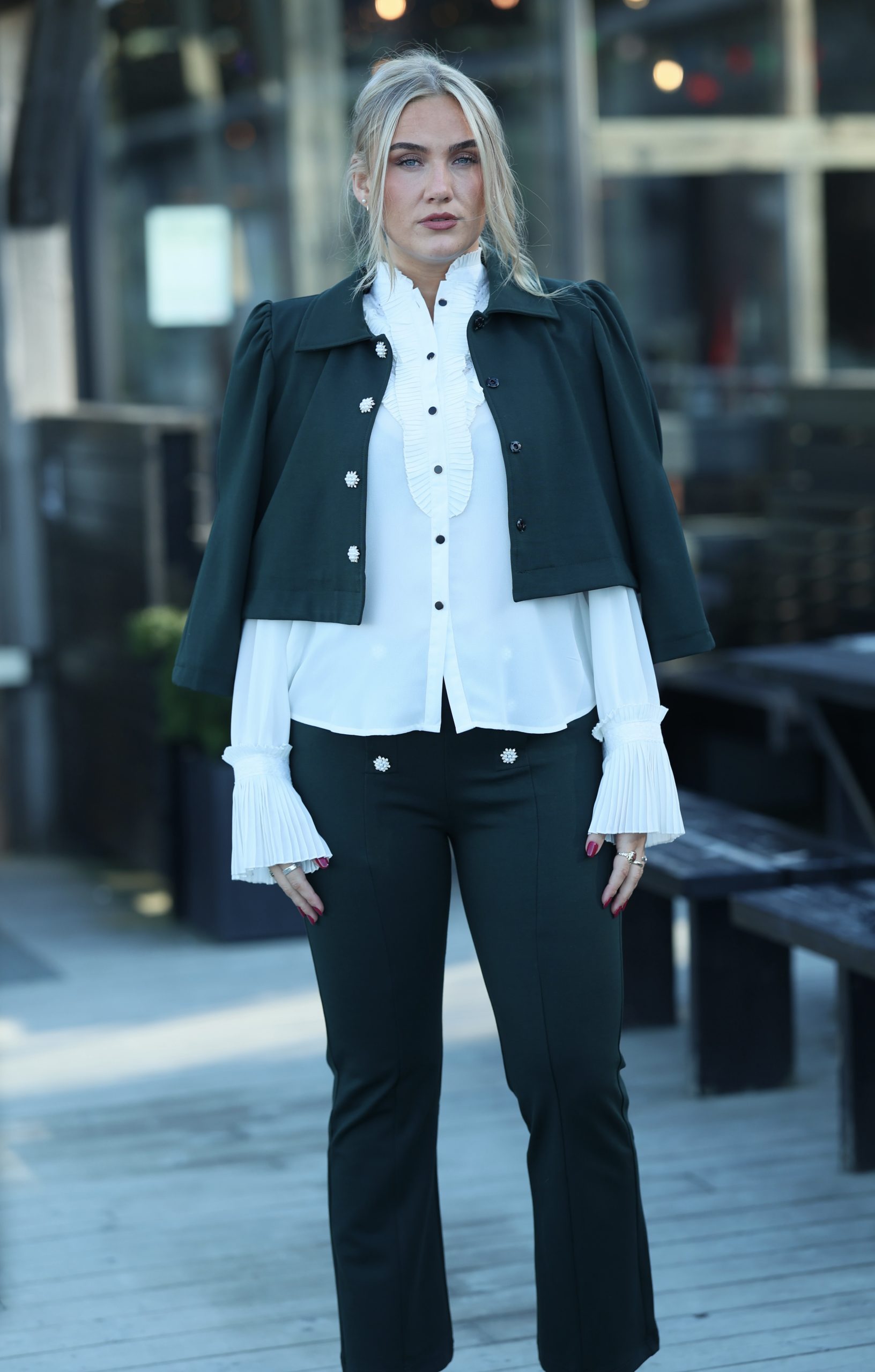 Helt fantastisk jakke i det deiligste stoffet med masse stretch og lekker passform. Jakken er perfekt over alle våre kjoler, men også over buksene i samme serie, skinnbukser, skjørt og jeans. Den har lekre knapper med «diamanter» og perler.