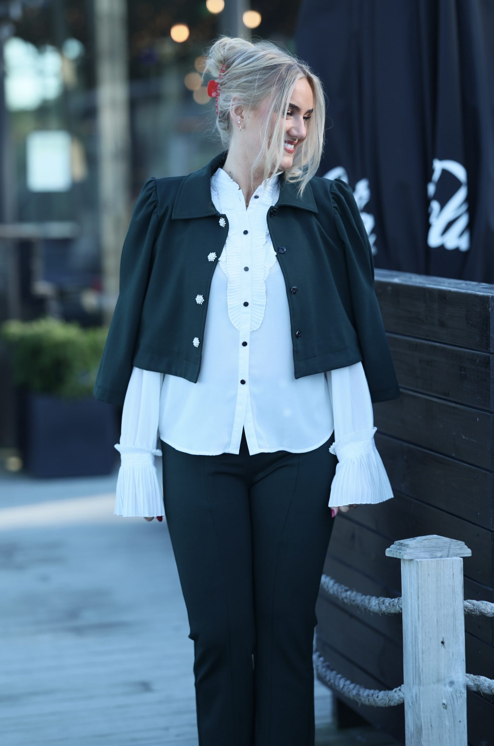 Helt fantastisk bukse i det deiligste stoffet med masse stretch og lekker passform. Buksen er perfekt alene, men også sammen med jakken i samme serie. Den har lekre knapper med «diamanter» og perler.