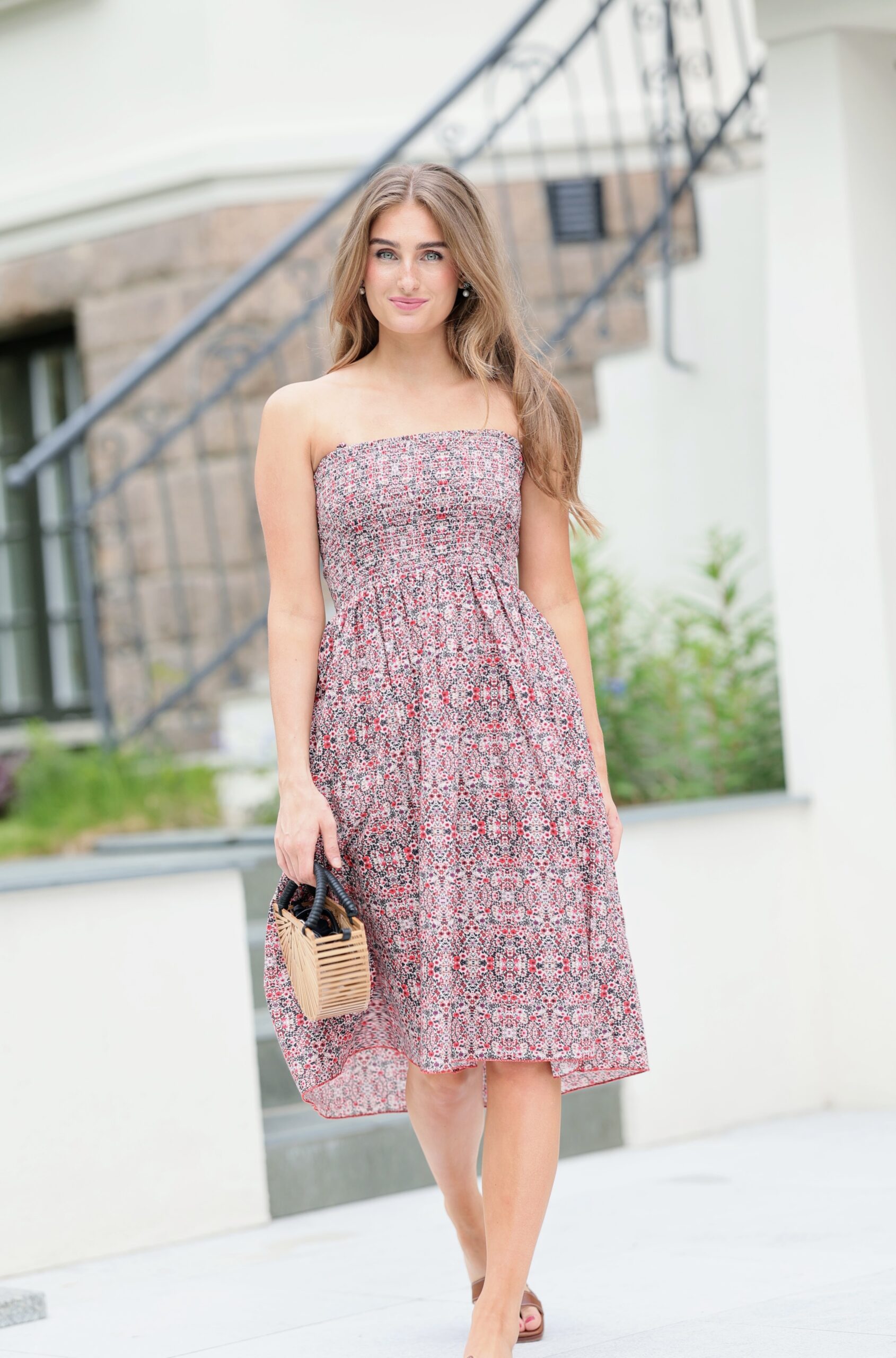 Båndene kan puttes inn i kjolen, så den kan brukes som tubekjole eller når den brukes som skjørt. Kjolen går til rett nedenfor knærne. Dette er den perfekte feriekjolen. Bare stapp den nedi kofferten og vit at du har en kjole for enhver anledning. Bruk den med en liten cardigan eller sjal på kvelden, så har du lett en kjole fra dag til kveld.